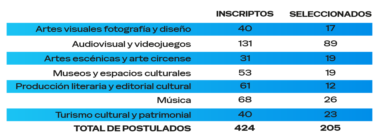 La convocatoria 2025 marcó un nuevo récord de participación, con 424 postulaciones presentadas en las siete categorías habilitadas: artes visuales, audiovisual, artes escénicas, literatura, música, museos y turismo cultural. De ese total, fueron seleccionados 205 proyectos que estarán disponibles para su consulta a partir del 5 de enero en esta página web.